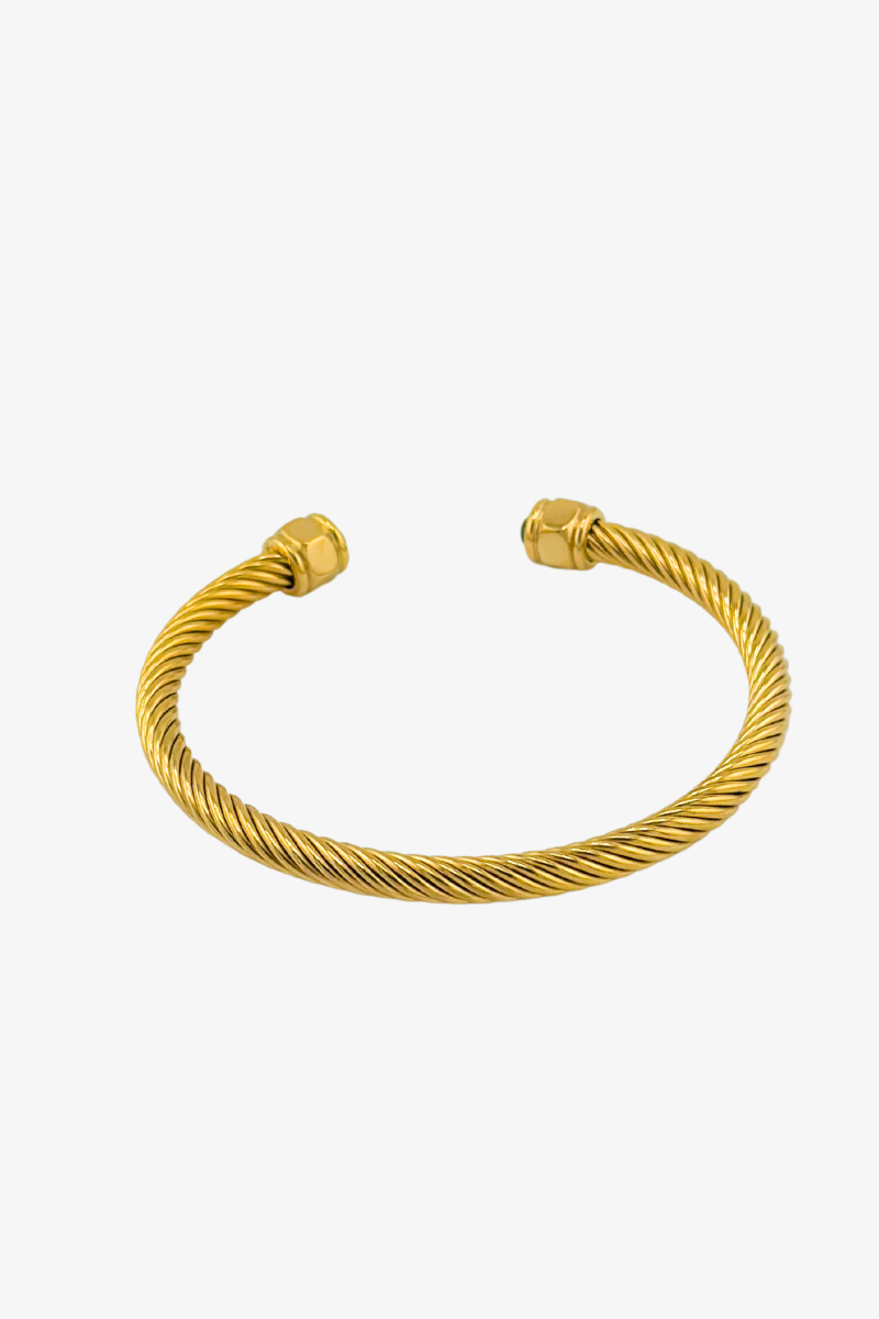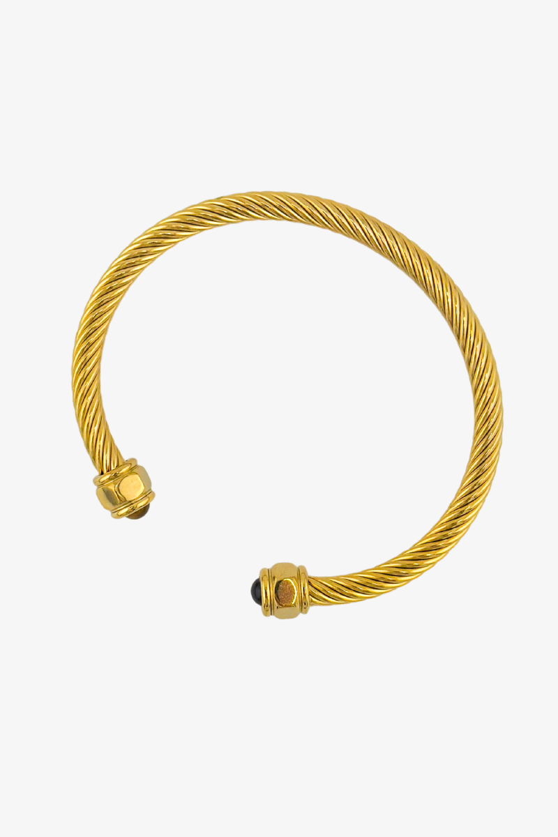 Stylowa bransoletka wykonana ze szlachetnej stali chirurgicznej platerowanej 18-karatowym złotem, zakończona naturalnym kamieniem Tygrysie Oko. Minimalistyczny design w połączeniu z naturalnymi elementami sprawia, że jest to idealny dodatek dla osób ceniących elegancję z nutą nowoczesności. Regulowana otwarta konstrukcja zapewnia wygodne dopasowanie i subtelne wykończenie każdej stylizacji. ✨🪶
