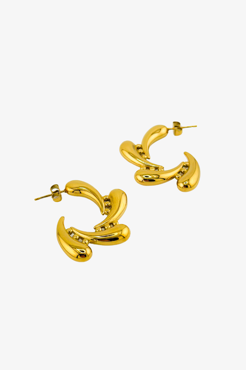 Kolczyki Multi Tear Drop to kwintesencja artystycznej elegancji, inspirowanej nurtem secesji, gdzie organiczne formy i płynne linie odgrywają kluczową rolę. Wykonane ze szlachetnej stali chirurgicznej platerowanej 18-karatowym złotem, przyciągają uwagę swoim niepowtarzalnym kształtem przypominającym krople w ruchu. Subtelne zdobienia w postaci drobnych detali nadają im wyrafinowanego charakteru, idealnie współgrając z ich dynamicznym, asymetrycznym designem. Te kolczyki to idealny wybór dla kobiet ceniących harmonię między klasyką a artystycznym wyrazem. Doda odrobiny dramatyzmu i tajemnicy zarówno codziennym, jak i wieczorowym stylizacjom. 🌙✨