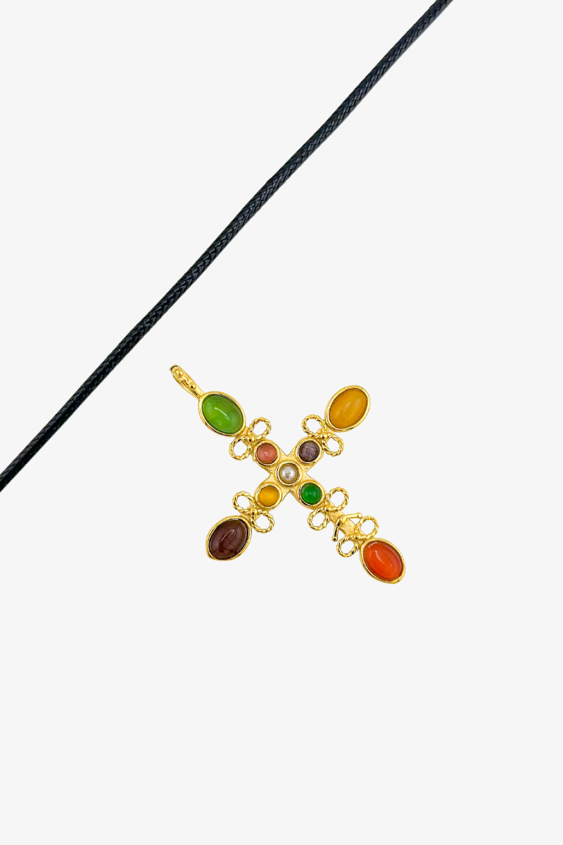 Naszyjnik Colorful Enameled Stones to unikalna biżuteria o klasycznym designie w stylu vintage. Wykonany ze szlachetnej stali chirurgicznej platerowanej 18-karatowym złotem, ozdobiony naturalnymi kamieniami w pięknych, żywych kolorach. Centralnym elementem jest krzyż, symbol elegancji i tradycji, który harmonijnie łączy bogactwo kolorów i artystyczne detale.